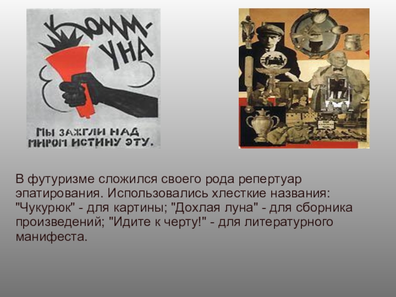 Слайд 49В футуризме сложился своего рода репертуар эпатирования. Использовались хлесткие названия: "Чукурюк"