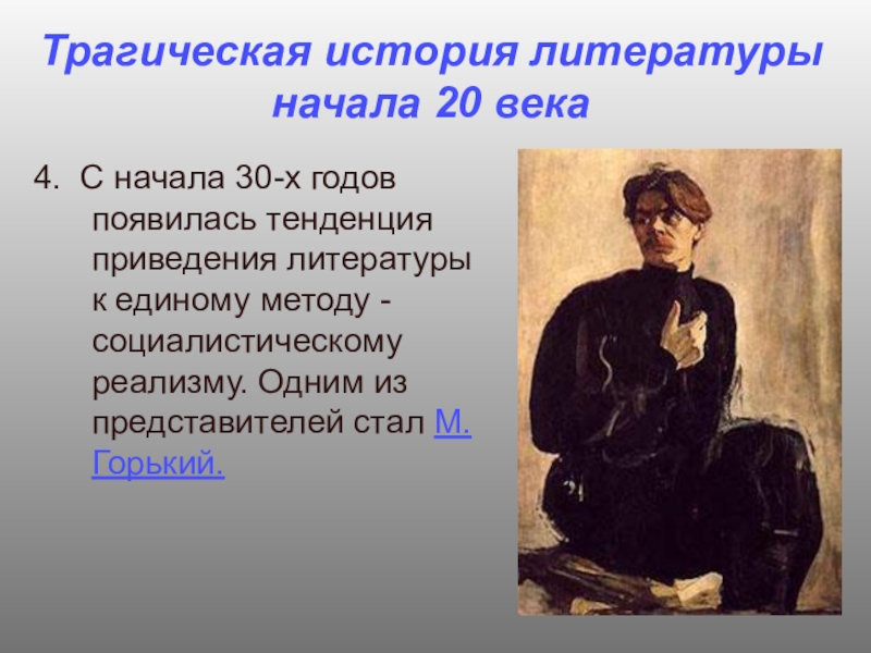 тенденция приведения литературы к единому методу - социалистическому реализму. Одним из представителей стал М.Горький.