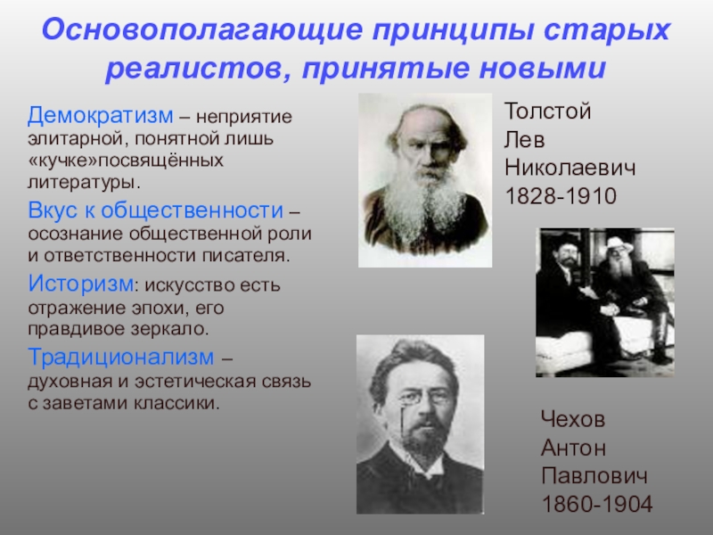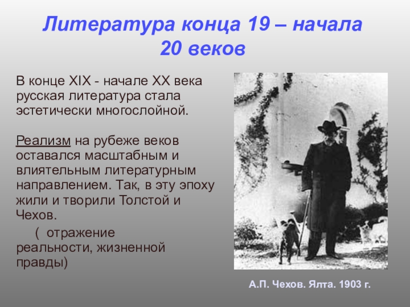 Реализм на рубеже веков оставался масштабным и влиятельным литературным направлением. Так, в эту эпоху жили и творили Толстой и Чехов.