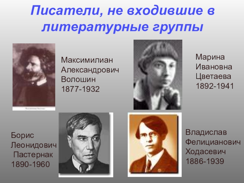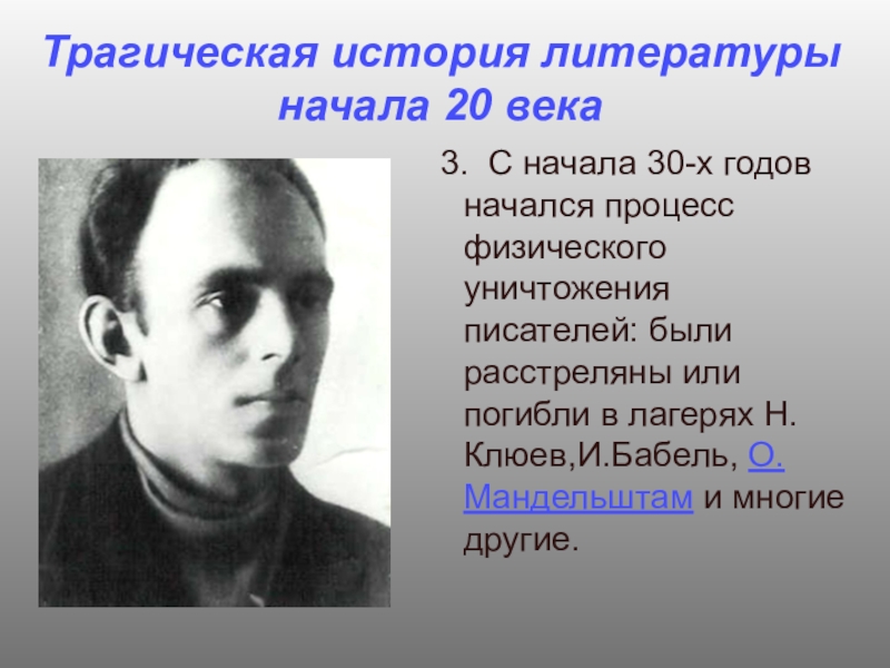 годов начался процесс физического уничтожения писателей: были расстреляны или погибли в лагерях Н.Клюев,И.Бабель, О.Мандельштам и многие другие.