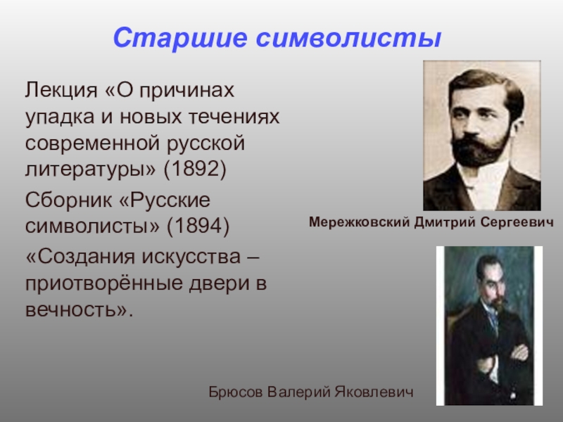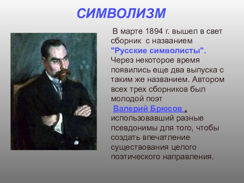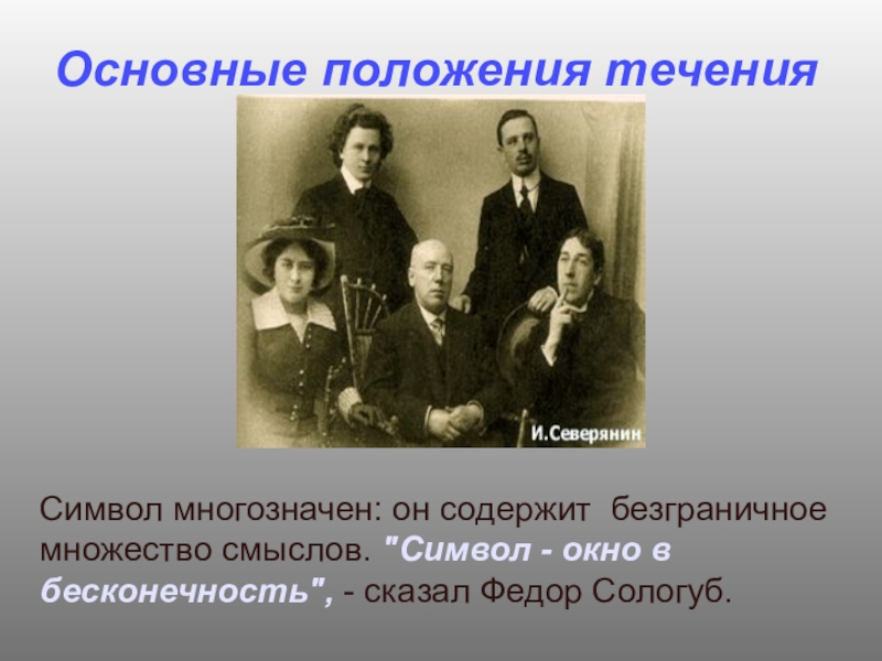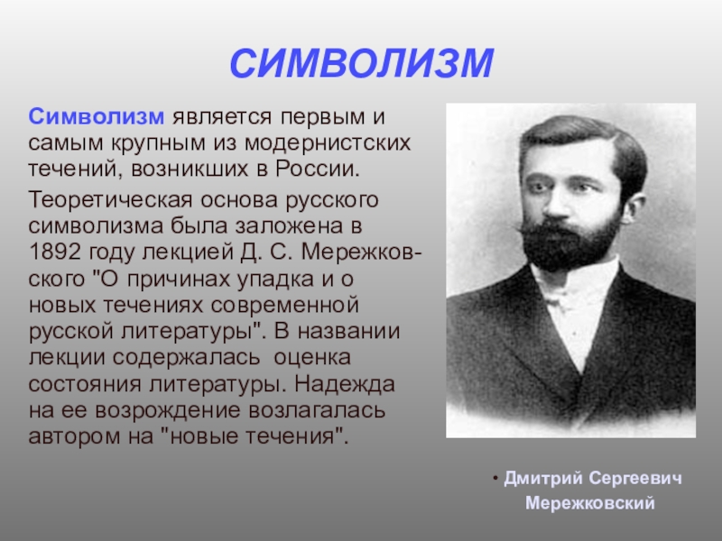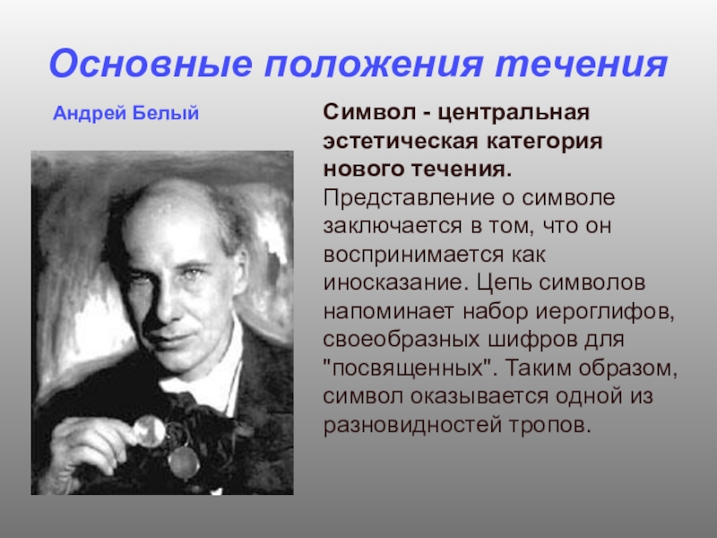 Символизм (от греч.symbolon- «знак, примета) - литературно-художественное направление, считавшее целью искусства интуитивное постижение мирового единства через символы.