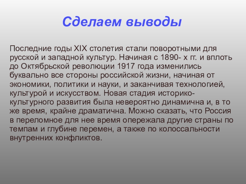 культур. Начиная с 1890- х гг. и вплоть до Октябрьской революции 1917 года изменились буквально все стороны российской жизни, начиная от экономики, политики и науки, и заканчивая технологией, культурой и искусством. Новая стадия историко-культурного развития была невероятно динамична и, в то же время, крайне драматична. Можно сказать, что Россия в переломное для нее время опережала другие страны по темпам и глубине перемен, а также по колоссальности внутренних конфликтов.