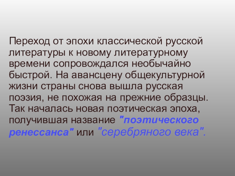 необычайно быстрой. На авансцену общекультурной жизни страны снова вышла русская поэзия, не похожая на прежние образцы. Так началась новая поэтическая эпоха, получившая название "поэтического ренессанса" или "серебряного века".
