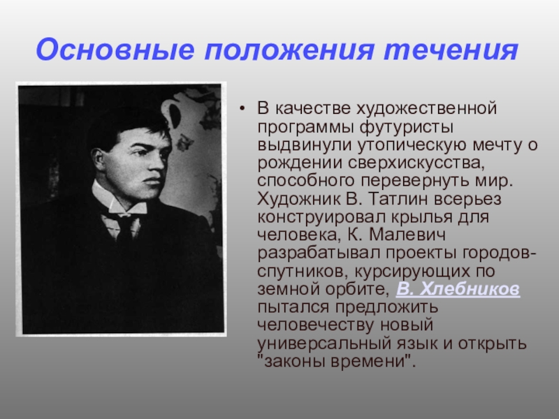 рождении сверхискусства, способного перевернуть мир. Художник В. Татлин всерьез конструировал крылья для человека, К. Малевич разрабатывал проекты городов-спутников, курсирующих по земной орбите, В. Хлебников пытался предложить человечеству новый универсальный язык и открыть "законы времени".