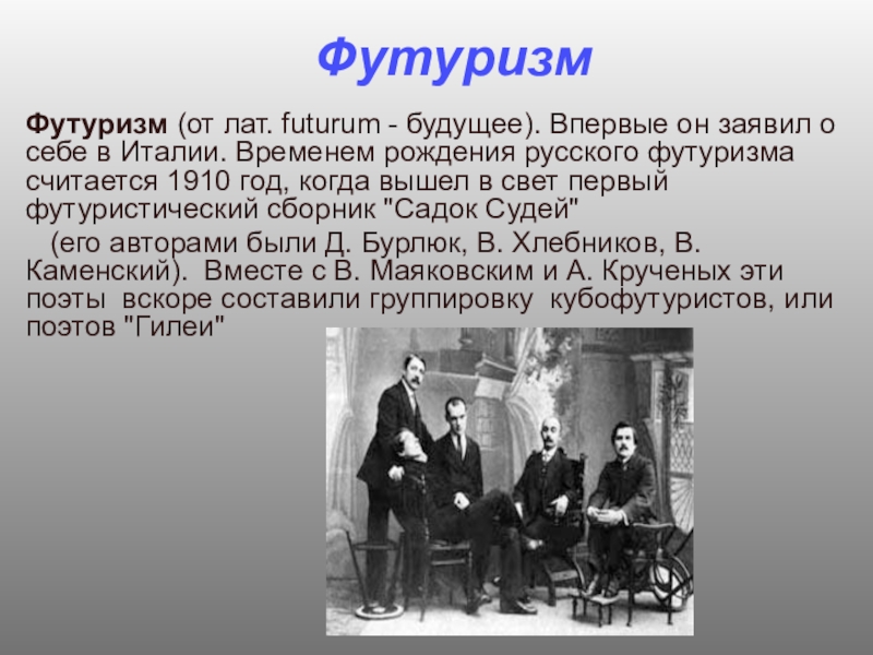 в Италии. Временем рождения русского футуризма считается 1910 год, когда вышел в свет первый футуристический сборник "Садок Судей"