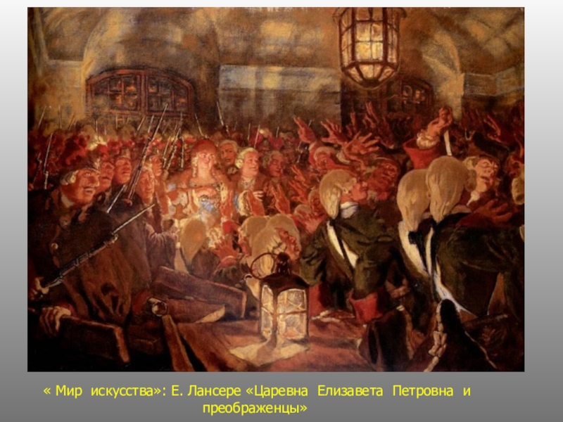 Слайд 13 « Мир искусства»: Е. Лансере «Царевна Елизавета Петровна и преображенцы»