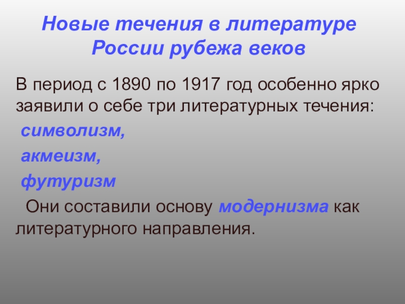 В период с 1890 по 1917 год особенно ярко заявили о себе три литературных течения - символизм, акмеизм и футуризм, которые составили основу модернизма как литературного направления.