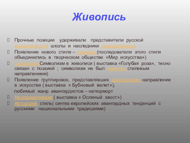 СимволизмСимволизм в живописи ( выставка «Голубая роза», тесно связан с поэзией ; символизм не был единым стилевым направлением)