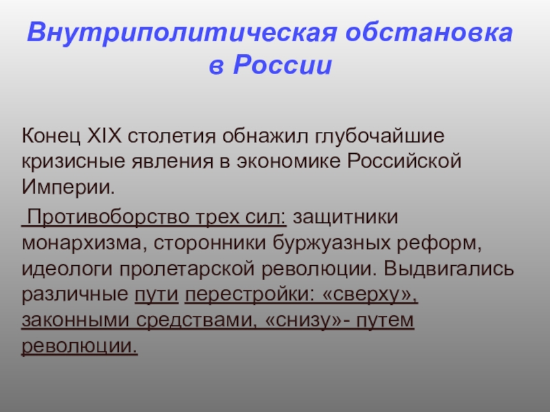 Противоборство трех сил: защитники монархизма, сторонники буржуазных реформ, идеологи пролетарской революции. Выдвигались различные пути перестройки: «сверху», законными средствами, «снизу»- путем революции.