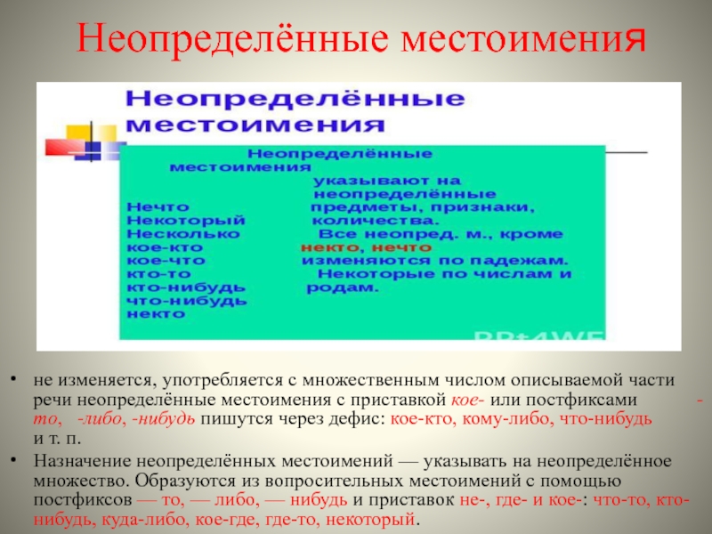 Назначение неопределённых местоимений — указывать на неопределённое множество. Образуются из вопросительных местоимений с помощью постфиксов — то, — либо, — нибудь и приставок не-, где- и кое-: что-то, кто-нибудь, куда-либо, кое-где, где-то, некоторый.