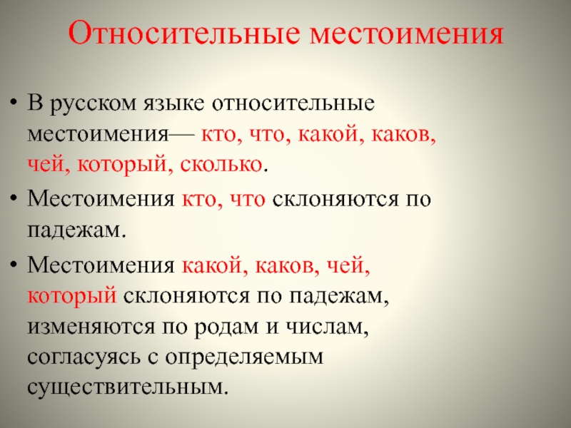 В русском языке относительные местоимения— кто, что, какой, каков, чей,