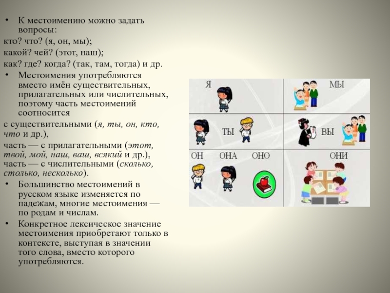 Местоимения употребляются вместо имён существительных, прилагательных или числительных, поэтому часть местоимений соотносится