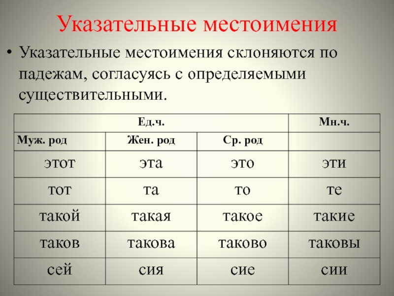 Указательные местоимения склоняются по падежам, согласуясь с определяемыми существительными.