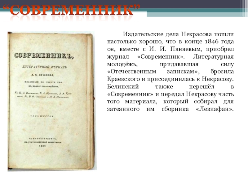 в конце 1846 года он, вместе с И. И. Панаевым, приобрел журнал «Современник». Литературная молодёжь, придававшая силу «Отечественным запискам», бросила Краевского и присоединилась к Некрасову. Белинский также перешёл в «Современник» и передал Некрасову часть того материала, который собирал для затеянного им сборника «Левиафан».