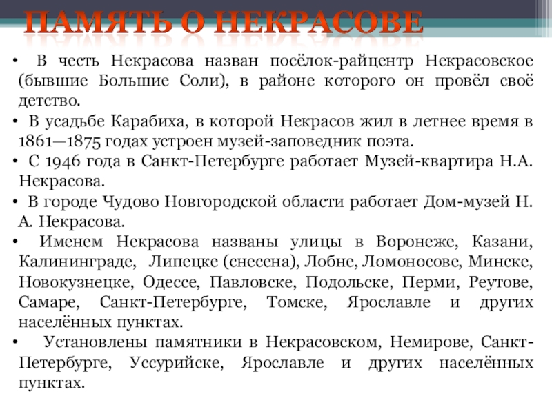Слайд 7 В честь Некрасова назван посёлок-райцентр Некрасовское (бывшие Большие Соли), в