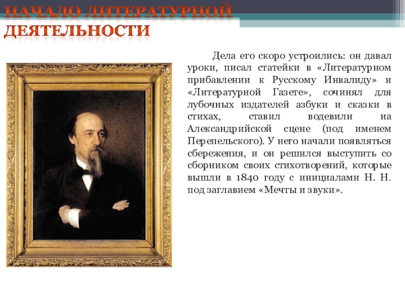 писал статейки в «Литературном прибавлении к Русскому Инвалиду» и «Литературной Газете», сочинял для лубочных издателей азбуки и сказки в стихах, ставил водевили на Александрийской сцене (под именем Перепельского). У него начали появляться сбережения, и он решился выступить со сборником своих стихотворений, которые вышли в 1840 году с инициалами Н. Н. под заглавием «Мечты и звуки».
