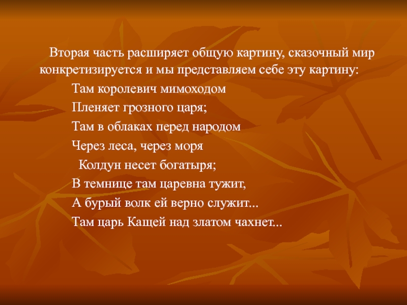 Слайд 28 Вторая часть расширяет общую картину, сказочный мир конкретизируется и мы