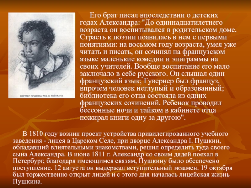 Слайд 6Его брат писал впоследствии о детских годах Александра: "До одиннадцатилетнего возраста
