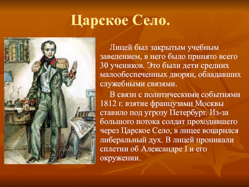 В связи с политическими событиями 1812 г. взятие французами Москвы ставило под угрозу Петербург. Из-за большого потока солдат проходившего через Царское Село, в лицее воцарился либеральный дух. В лицей проникали сплетни об Александре I и его окружении.