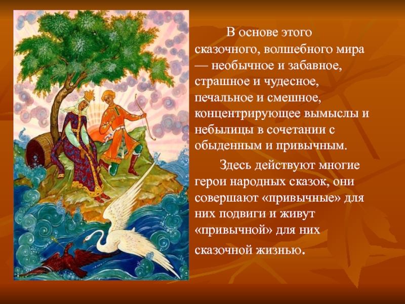 Здесь действуют многие герои народных сказок, они совершают «привычные» для них подвиги и живут «привычной» для них сказочной жизнью.
