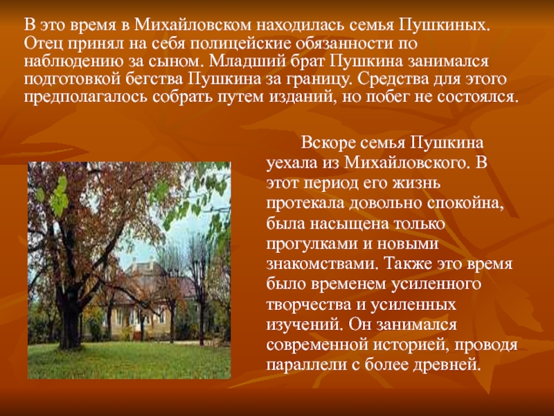 Слайд 15 Вскоре семья Пушкина уехала из Михайловского. В этот период его жизнь