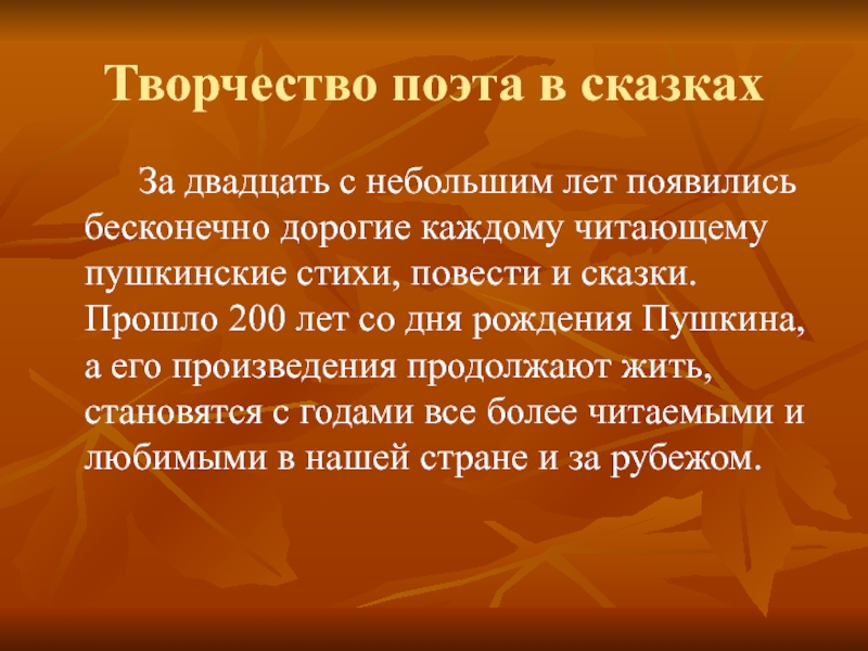 дорогие каждому читающему пушкинские стихи, повести и сказки. Прошло 200 лет со дня рождения Пушкина, а его произведения продолжают жить, становятся с годами все более читаемыми и любимыми в нашей стране и за рубежом.