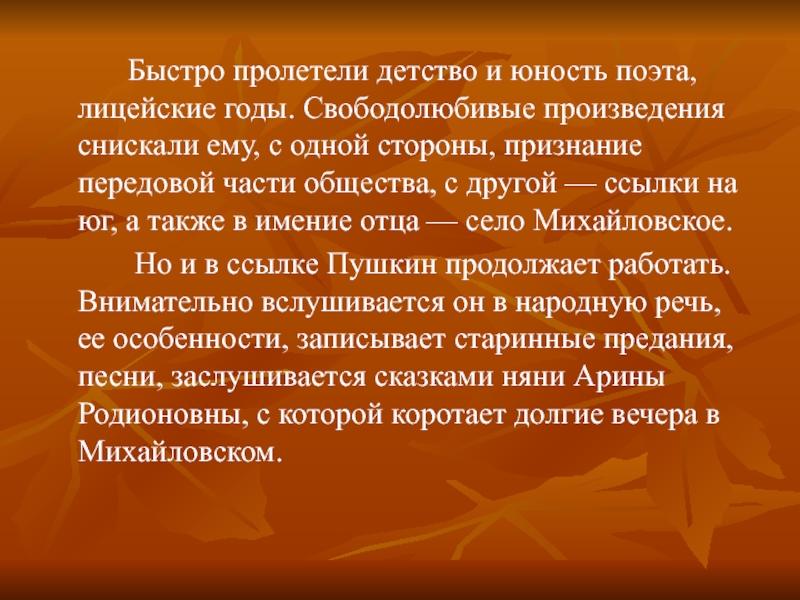 Но и в ссылке Пушкин продолжает работать. Внимательно вслушивается он в народную речь, ее особенности, записывает старинные предания, песни, заслушивается сказками няни Арины Родионовны, с которой коротает долгие вечера в Михайловском.