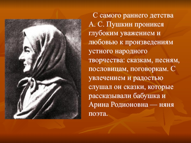 и любовью к произведениям устного народного творчества: сказкам, песням, пословицам, поговоркам. С увлечением и радостью слушал он сказки, которые рассказывали бабушка и Арина Родионовна — няня поэта.