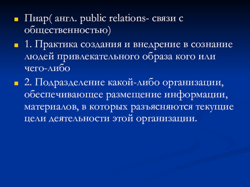 Пиар( англ. public relations- связи с общественностью)1. Практика создания и внедрение в сознание людей привлекательного образа кого