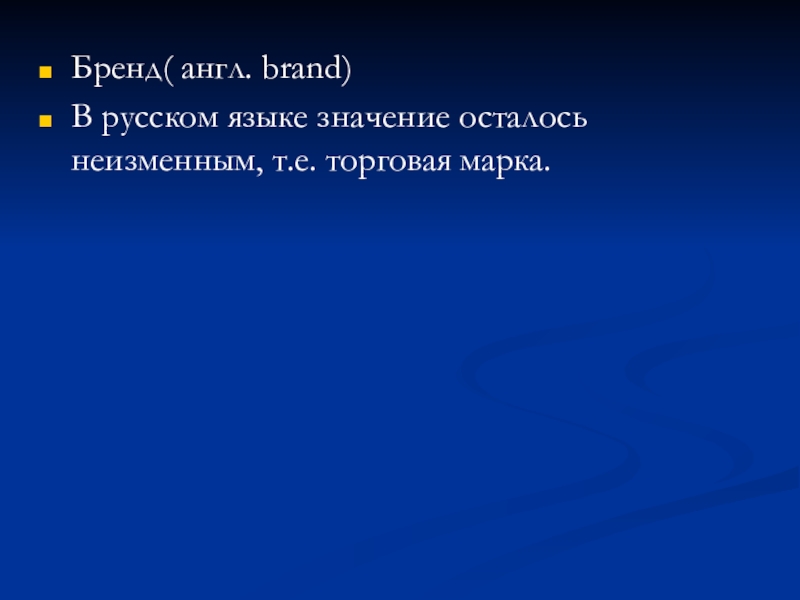 Бренд( англ. brand)В русском языке значение осталось неизменным, т.е. торговая марка.