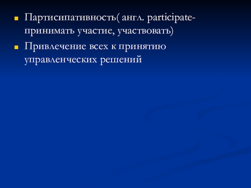 Партисипативность( англ. participate- принимать участие, участвовать)Привлечение всех к принятию управленческих решений