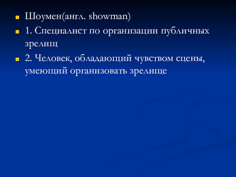 Шоумен(англ. showman)1. Специалист по организации публичных зрелищ2. Человек, обладающий чувством сцены, умеющий организовать зрелище
