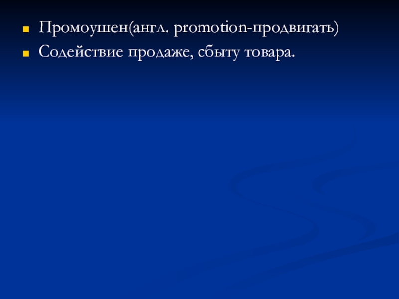 Промоушен(англ. promotion-продвигать) Содействие продаже, сбыту товара.