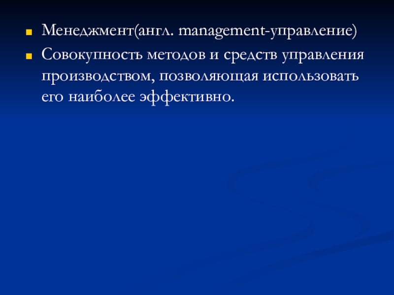Менеджмент(англ. management-управление)Совокупность методов и средств управления производством, позволяющая использовать его наиболее эффективно.