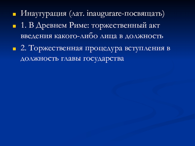 Инаугурация (лат. inaugurare-посвящать)1. В Древнем Риме: торжественный акт введения какого-либо лица в должность2. Торжественная процедура вступления в