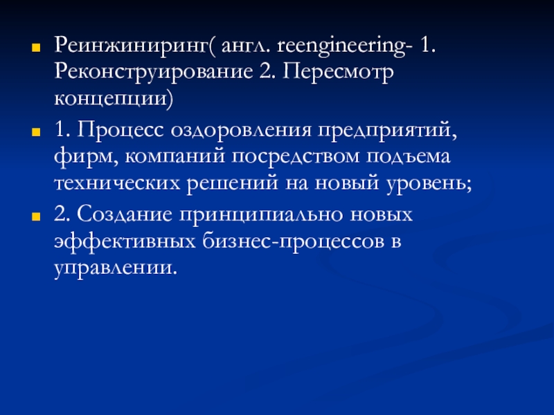Реинжиниринг( англ. reengineering- 1.Реконструирование 2. Пересмотр концепции)1. Процесс оздоровления предприятий, фирм, компаний посредством подъема технических решений на