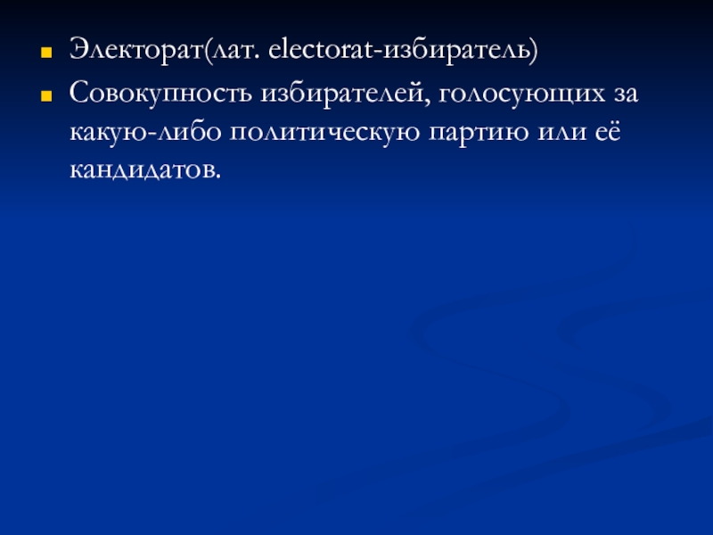 Электорат(лат. electorat-избиратель)Совокупность избирателей, голосующих за какую-либо политическую партию или её кандидатов.