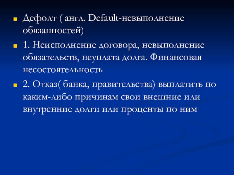 Дефолт ( англ. Default-невыполнение обязанностей) 1. Неисполнение договора, невыполнение обязательств, неуплата долга. Финансовая несостоятельность2. Отказ( банка, правительства) выплатить по каким-либо причинам свои внешние или внутренние долги или проценты по ним