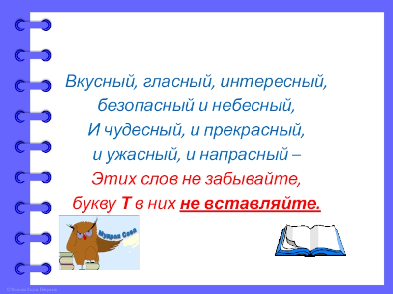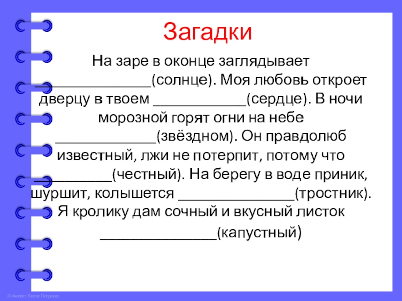 твоем ____________(сердце). В ночи морозной горят огни на небе _____________(звёздном). Он правдолюб известный, лжи не потерпит, потому что __________(честный). На берегу в воде приник, шуршит, колышется _______________(тростник). Я кролику дам сочный и вкусный листок _______________(капустный)