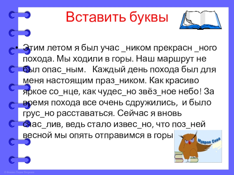 ходили в горы. Наш маршрут не был опас_ным. Каждый день похода был для меня настоящим праз_ником. Как красиво яркое со_нце, как чудес_но звёз_ное небо! За время похода все очень сдружились, и было грус_но расставаться. Сейчас я вновь счас_лив, ведь стало извес_но, что поз_ней весной мы опять отправимся в горы.