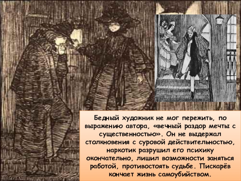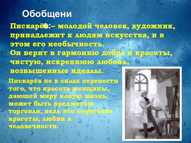 Пискарёв не в силах перенести того, что красота женщины, дающей миру новую жизнь, может быть предметом торговли, ведь это поругание красоты, любви и человечности.