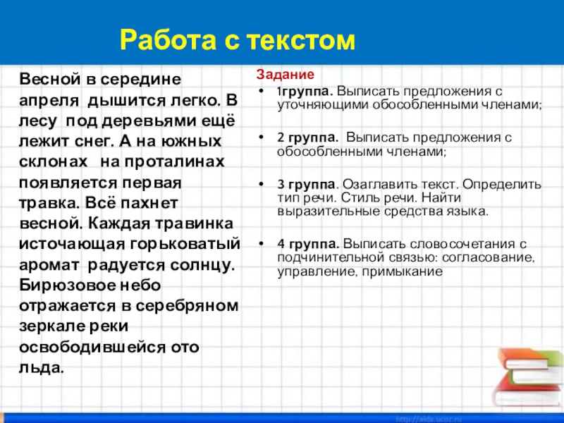 Весной в середине апреля дышится легко. В лесу под деревьями ещё лежит снег. А на южных склонах на проталинах появляется первая травка. Всё пахнет весной. Каждая травинка источающая горьковатый аромат радуется солнцу. Бирюзовое небо отражается в серебряном зеркале реки освободившейся ото льда.