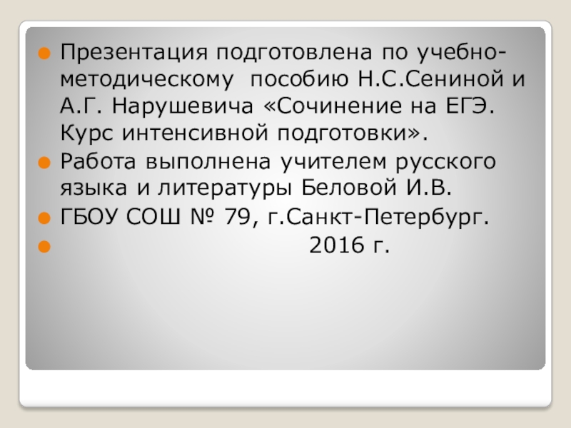 Презентация подготовлена по учебно- методическому пособию Н.С.Сениной и А.Г. Нарушевича «Сочинение на ЕГЭ. Курс интенсивной подготовки».Работа выполнена