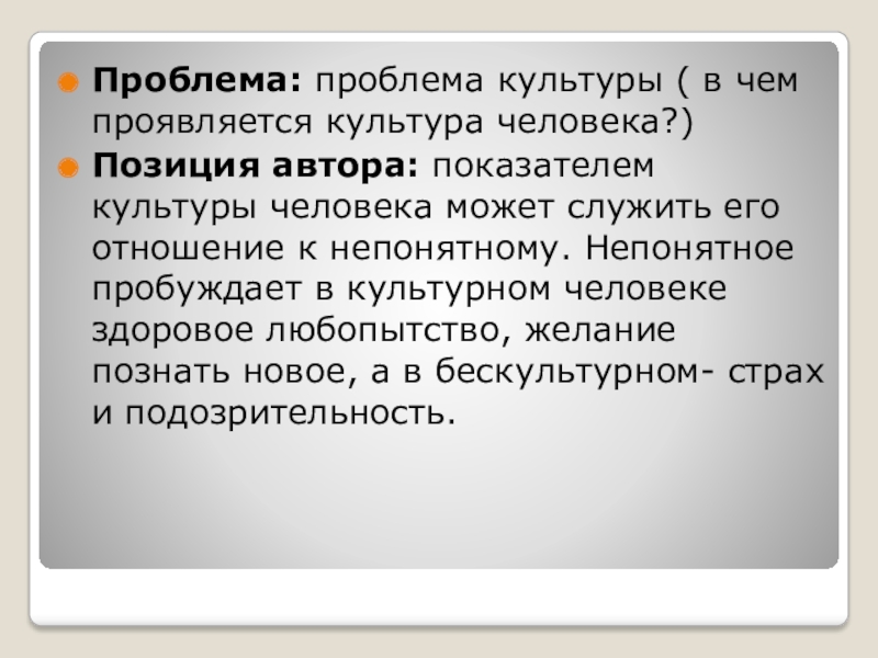 Проблема: проблема культуры ( в чем проявляется культура человека?)Позиция автора: показателем культуры человека может служить его отношение