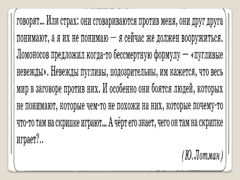 культуры человека может служить его отношение к непонятному. Непонятное пробуждает в культурном человеке здоровое любопытство, желание познать новое, а в бескультурном- страх и подозрительность.