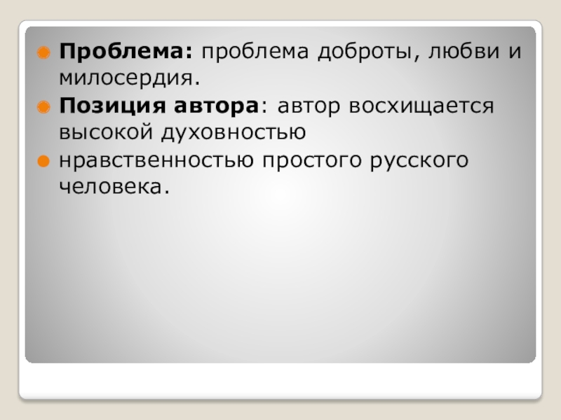 Проблема: проблема доброты, любви и милосердия.Позиция автора: автор восхищается высокой духовностьюнравственностью простого русского человека.