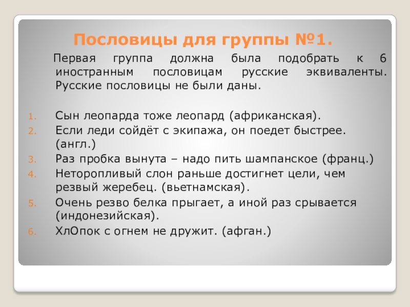 пословицам русские эквиваленты. Русские пословицы не были даны.