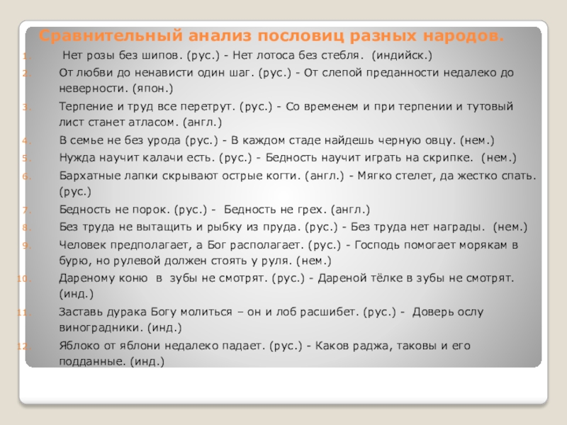 Слайд 4Сравнительный анализ пословиц разных народов.