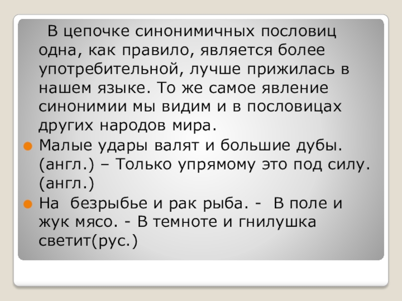 Слайд 7 В цепочке синонимичных пословиц одна, как правило, является более употребительной, лучше