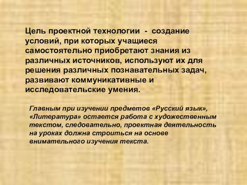 Главным при изучении предметов «Русский язык», «Литература» остается работа с художественным текстом, следовательно, проектная деятельность на уроках должна строиться на основе внимательного изучения текста.